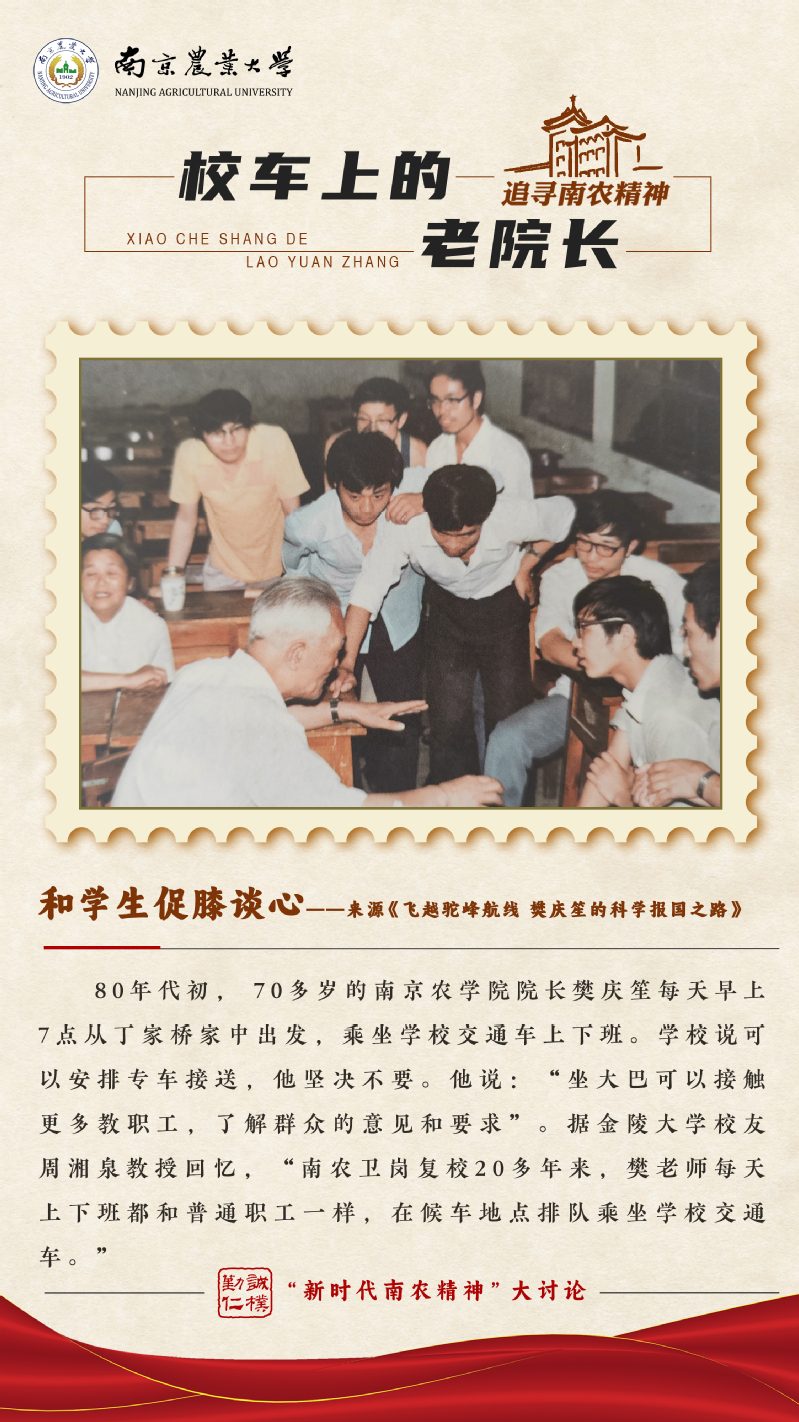 80年代初,70多歲的南京農(nóng)學(xué)院院長樊慶笙每天早上7點(diǎn)從丁家橋家中出發(fā),乘坐學(xué)校交通車上下班。學(xué)校說可以安排專車接送,他堅(jiān)決不要。他說:“坐大巴可以接觸更多教職工,了解群眾的意見和要求”。據(jù)金陵大學(xué)校友周湘泉教授回憶,“南農(nóng)衛(wèi)崗復(fù)校20多年來,樊老師每天上下班都和普通職工一樣,在候車地點(diǎn)排隊(duì)乘坐學(xué)校交通車。”