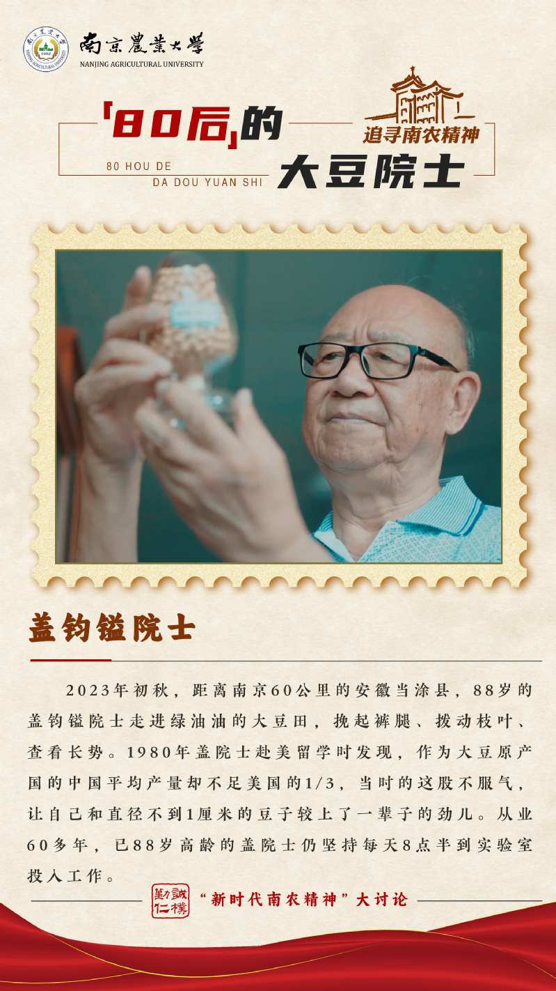 初秋,距離南京60公里的安徽當涂縣,87歲的蓋鈞鎰院士走進綠油油的大豆田,挽起褲腿、撥動枝葉、查看長勢。1980年蓋院士赴美留學時發(fā)現(xiàn),作為大豆原產國的中國平均產量卻不足美國的1/3,當時的這股不服氣,讓自己和直徑不到1厘米的豆子較上了一輩子的勁兒。從業(yè)60多年,已87歲高齡的蓋院士仍堅持每天8點半到實驗室投入工作。