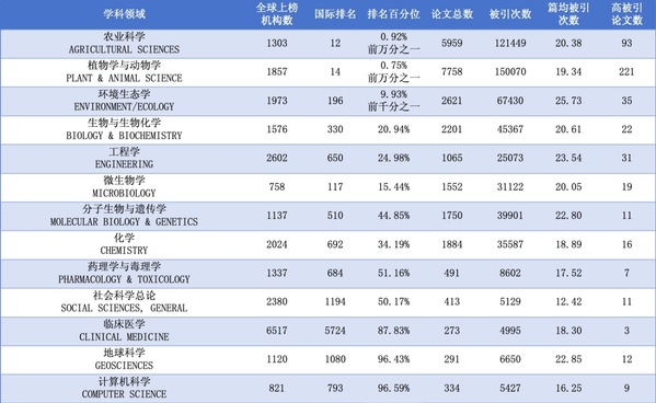截至目前,我校共有13個學科位列全球前百分之一,其中植物學與動物學、農業科學2個學科穩居全球排名前萬分之一,環境生態學進入前千分之一,彰顯了我校在相關學科領域的研究實力和廣泛國際影響力。