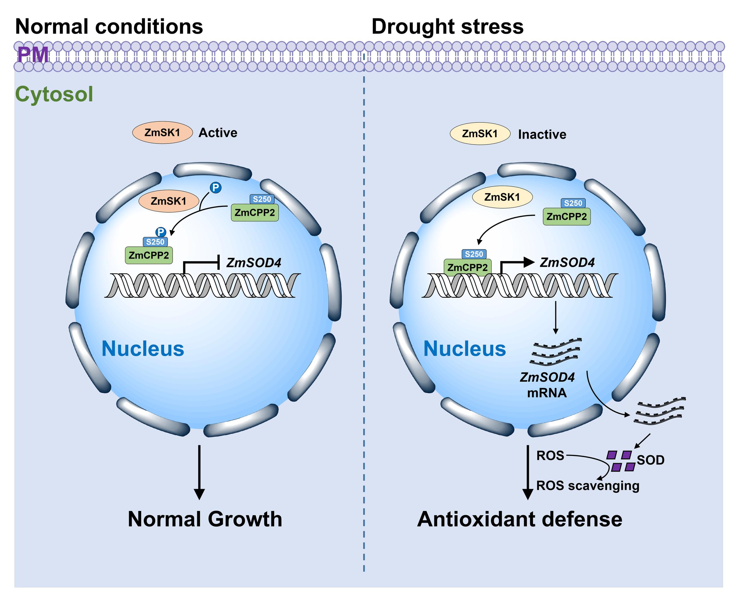 研究發(fā)現(xiàn),富含半胱氨酸多梳樣蛋白(CPP)轉(zhuǎn)錄因子ZmCPP2能夠與ZmSK1發(fā)生蛋白質(zhì)相互作用,并能直接結(jié)合一個(gè)重要抗氧化防護(hù)酶---超氧化物歧化酶(SOD)基因ZmSOD4的啟動(dòng)子,增強(qiáng)抗氧化防護(hù)酶SOD活性,進(jìn)而增強(qiáng)玉米耐旱性。進(jìn)一步研究發(fā)現(xiàn),ZmSK1能夠磷酸化ZmCPP2的Ser-250位點(diǎn),抑制ZmCPP2與ZmSOD4啟動(dòng)子的結(jié)合。該研究闡明了GSK3類激酶通過磷酸化修飾調(diào)控轉(zhuǎn)錄因子活性,進(jìn)而影響抗氧化防護(hù)系統(tǒng)的干旱脅迫響應(yīng)機(jī)制。這一發(fā)現(xiàn)不僅深化了我們對(duì)植物干旱脅迫應(yīng)答機(jī)制的理解,也為作物耐旱育種提供了新的理論依據(jù)和分子靶點(diǎn)。